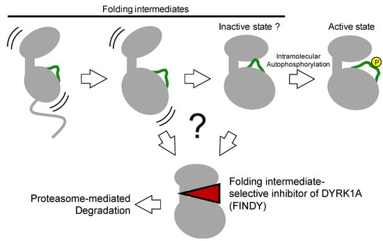 Graphical representation of the folding intermediate selective inhibition of the protein kinase DYRK1A by FINDY. FINDY selectively binds to the folding intermediate and inhibits the progression of the folding process, resulting in proteasome-mediated degradation in the cytoplasm. DYRK1A autophosphorylation has been demonstrated to be a one-off inceptive event required for activation [62,63]. Once the folding process is completed, DYRK1A cannot re-autophosphorylate. On the other hand, FINDY does not inhibit the fully folded form of DYRK1A, which corresponds to the active state. The intermediate state targeted by FINDY has not been clarified.