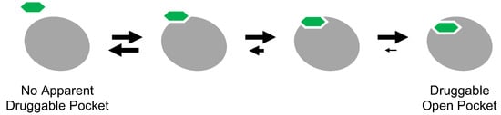 Cryptic binding sites are metastable pockets apparent on the protein surface only when a small molecule is bound (Figure 7) [68,69]. These sites are not easily detectable on the unbound structure. The protein structure is in thermodynamic equilibrium and fluctuates dynamically. In other words, the protein surface can take on various structures according to its thermodynamic equilibrium under particular physiological conditions. In structural biology, the most abundant and stable population of a given protein structure is usually observed, while the rare and unstable structures are missed, although these can also be targeted by small molecules [70,71,72]. Because many proteins appear to lack druggable surface pockets, the concept of cryptic binding sites has received considerable attention, as this would expand the druggable proteome.