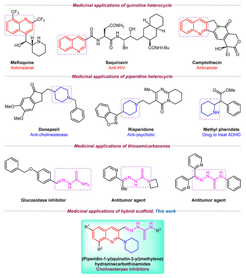 Among nitrogen-containing heterocycles, quinoline is considered as an important scaffold due to its marvelous pharmacological potential [12,13]. Several commercial drugs such as Primaquine®, Plasmoquine®, Mefloquine®, Chloroquine®, OSI-930, and Saquinavir® incorporate quinoline pharmacophore [14,15]. A range of quinoline derivatives have been reported for their analgesic [16], antifungal [17], antibacterial [18], antioxidant [19], anticancer [20,21], anti-inflammatory [22], antiviral [23,24], anti-Alzheimer [25], cytotoxic [26], antileishmanial [27,28], and anti-hypertensive activities [29,30]. Similarly, piperidine ring is also prevalent in numerous naturally occurring alkaloids [31]. According to FDA Orange Book, piperidine ring falls among the top classified scaffolds in the list of 100 most exploited simple ring systems in drug design and synthesis [32]. Piperidine derivatives also demonstrate various biological functions such as antimalarial [33], anticonvulsant [34], anticancer [35], and antidepressant [36] activities. Crizotinib® [37], Donepezil® [38], Risperidone® [39], and Methyl phenidate® [40] are the well-known examples of piperidine-based drugs (Figure 1). Likewise, thiosemicarbazones are emerging scaffolds of medicinal interest and their antimicrobial [41,42], anti-inflammatory [43], antioxidant [44,45], anticancer [46,47,48], anti-Alzheimer [49], and alpha-glucosidase inhibitory [50] activities have been reported in recent years.