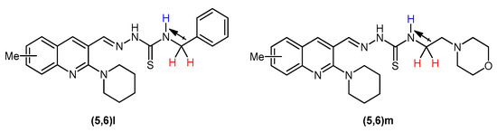 The peaks of aromatic protons, depending upon their chemical environment, were seen in a range of 7.05–8.37 ppm. Among aromatic protons, the singlet for H4 of quinoline ring showed the highest chemical shift around 8.29–8.37 ppm. In the spectral data of compounds 5e, 5h, and 6h, the aromatic protons appeared downfield referring to the presence of electronegative fluoro and chloro group at ortho position of thioamide functionality. In the spectral data of compounds (5,6)m, the six methylene protons referring to four –OCH2 protons of morpholine ring and two protons of thioamide NH-CH2 emerged as a multiplet around 3.89–3.97 ppm while the six N–CH2 protons connected to nitrogen of morpholine ring gave a multiplet peak around 2.90–2.70 ppm. In compounds (5,6)l, the methylene of benzyl appeared as a triplet at 4.90 ppm, the higher chemical shift and splitting of signal owing to the vicinity of the –NH (Figure 3). Likewise, the piperidine ring protons appeared as two multiplet peaks near 1.70 and 3.25 ppm, respectively.