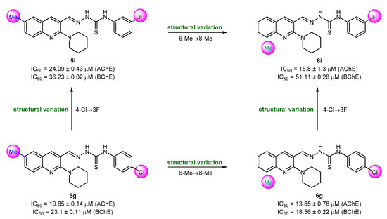 The compounds with 8-methyl substitution exhibited good results with three compounds (6d, 6f, and 6g) acting as dual inhibitors with IC50 < 20 μM against AChE and BChE. Among them, 6f emerged as the most potent inhibitor against both enzymes with IC50 values of 9.68 ± 0.21 μM (AChE) and 11.59 ± 1.2 μM (BChE). Compound 6f incorporates a 3-chlorophenyl ring as R3 substituent. The introduction of a di-substitution (2,6-dimethyl) caused a detrimental effect on the inhibitory potency (compound 6d). Similar trend was also noticed when chlorine substituent was moved to position 4 at the phenyl ring (compound 6g) (Figure 5). The effect on the anti-cholinergic activity by different substituents such as chloro, fluoro, and methyl on the phenyl group of hydrazine carbothioamide moiety was also evaluated [65]. Anti-cholinesterase potential was predominant for the meta substituted chloro and fluoro molecules when 8-position of quinoline is occupied by a methyl substituent.