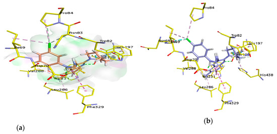 The active pocket of BChE was surrounded by amino acid residues Tyr332, Ser198, Met437, Glu197, Ala328, Asp70, Trp430, Phe73, Gly121, Thr120, Trp82, Ile442, Gly115, Gly117, Trp231, Ser79, His438, Tyr332, Tyr440, and Val331 [53]. The detailed analysis of tacrine (tetrahydroacridin-9-amine) suggested the presence of two π-alkyl (4.32 and 4.97 Å) and four π-π stacked bonds (4.25, 4.23, 5.61, and 3.59 Å) with Trp82 and a π-alkyl linkage (4.56 Å) with Ala328. All the interactions were presented by amino acid residues Trp82 and Ala328 as shown in Figure 7.