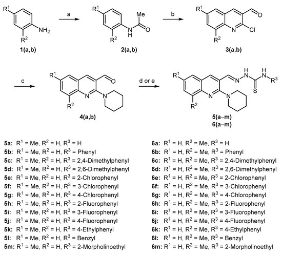 A library of new piperidine containing quinolinyl thiosemicarbazones 5(am) and 6(am) was synthesized using a facile synthetic approach as illustrated in Scheme 1. Acetylation of the commercial anilines 1(a,b) produced acetanilides 2(a,b) which underwent Vilsmeier–Haack formylation using dimethylformamide and phosphoryl chloride affording 2-chloroquinoline-3-carbaldehydes 3(a,b) in 65–75% yield [60]. Subsequently, cetyltrimethylammonium bromide (CTAB) catalyzed nucleophilic aromatic substitution of 3(a,b) with piperidine in polyethylene glycol-400 (PEG-400) produced 2-(piperidin-1-yl)quinoline-3-carbaldehydes 4(a,b) in 97–98% yield [61]. Finally, microwave-assisted condensation of 4(a,b) with a range of thiosemicarbazides afforded the desired hybrid compounds 5(am) and 6(am) in excellent yields in 3–5 min (Table 1). The target compounds were also prepared using the conventional approach, however, the isolated yields were lower compared to microwave-assisted methodology. The comparative yields are given in Table 1. Two-point structural diversity was introduced in the target compounds. Quinoline pharmacophore inherits 6- and 8-substitutions (R1 and R2) from commercially available anilines whereas electron-rich and electron-deficient groups were introduced at the aromatic ring (R3) in the thiosemicarbazides. Benzyl and morpholinoethyl were also found as successful substituents as R3 on the thiosemicarbazide moiety.