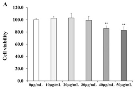 We conducted an MTT assay to examine the cytotoxicity after AGE treatment (Figure 2). AGE was treated with diverse concentrations (10, 20, 30, 40, and 50 µg/mL) to HDFs. We determined that there was no significant change in the cell viability of HDFs up to 30 µg/mL of AGE. The group treated with 40 µg/mL of AGE decreased to 86% of the control group. Therefore, we set the concentrations (7.5, 15, and 30 µg/mL) of AGE in this research.
