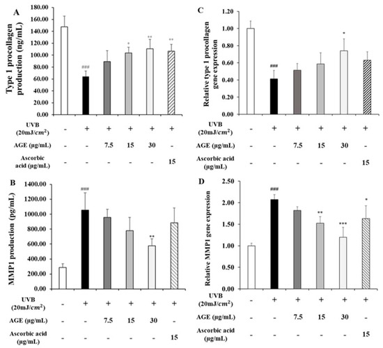 Effect of AGE on type I procollagen and MMP-1 level in UVB-irradiated HDFs. HDFs were irradiated with UVB (20 mJ/cm2), followed by treatment with 7.5, 15, and 30 µg/mL of AGE. After 24 h of incubation, detection of type I procollagen (A) and MMP-1 (B) production were performed by using ELISA kits. Gene expression of COL1A1 (C) and MMP-1 (D) were determined by quantitative real-time (qRT)-PCR. All data were expressed as the mean ± SD of at least three independent experiments. ### p < 0.001 versus untreated cells, * p < 0.05, ** p < 0.01, and *** p < 0.001 versus UVB-irradiated cells.