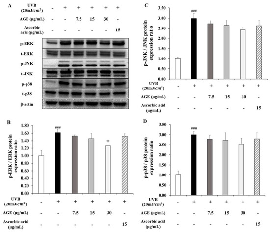 Effects of AGE on MAPK signaling pathway in UVB-irradiated HDFs. HDFs were irradiated with UVB (20 mJ/cm2), followed by treatment with 7.5, 15, and 30 µg/mL of AGE. After 24 h incubation, protein extraction was performed. Phosphorylation and total protein ratios of ERK (B), JNK (C), and p38 (D) were measured using Western blot (A). All data were expressed as the mean ± SD of at least three independent experiments. ### p < 0.001 versus untreated cells, ** p < 0.01 versus UVB-irradiated cells.