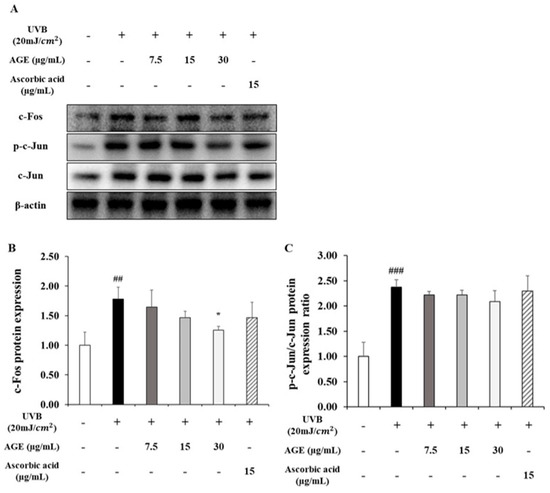 As shown in Figure 5, in the UVB-exposed group, c-Fos expression, which is the subunit of AP-1, was stimulated by 1.8-fold compared to the untreated group. By contrast, c-Fos expression was decreased by 67% in 30 µg/mL of AGE. c-Jun, another subunit of AP-1, is activated by 2.4-fold of the nonirradiated group. However, c-Jun phosphorylation was decreased by 22% in the 30 µg/mL of AGE. Therefore, it can be concluded that AGE decreased c-Fos expression significantly. AGE also downregulated the phosphorylated form of c-Jun; however, there was no statistically significant difference.