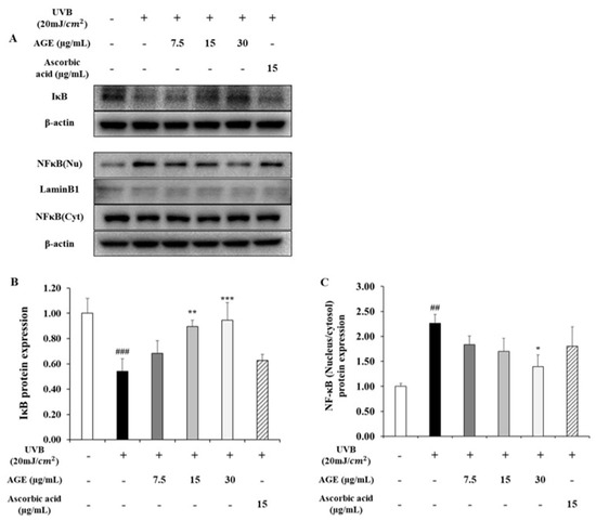 Effects of AGE on the expression of NF-κB signaling pathway in UVB-irradiated HDFs. HDFs were irradiated with UVB (20 mJ/cm2), followed by treatment with 7.5, 15, and 30 µg/mL of AGE. After 24 h of incubation, protein extraction was performed. Protein expressions of IκB (B), nucleus, and cytosolic NF-κB (C) were determined by Western blot (A). All data were expressed as the mean ± SD of at least three independent experiments. ## p < 0.01 and ### p < 0.001 versus untreated cells, * p < 0.05, ** p < 0.01, and *** p < 0.001 versus UVB-irradiated cells.