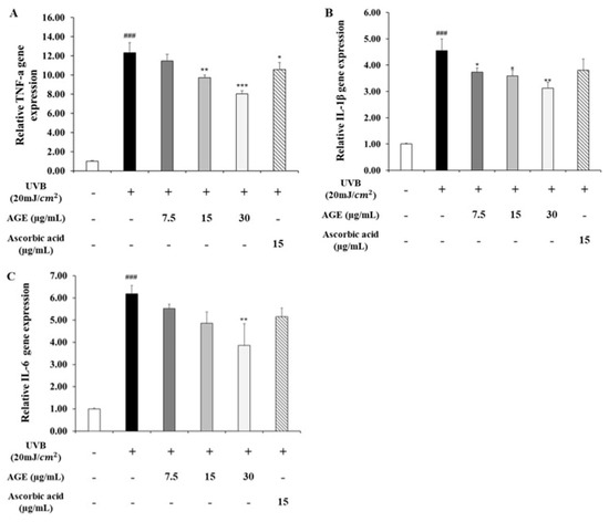 Effects of AGE on the expression of inflammatory cytokines in UVB-irradiated HDFs. HDFs were irradiated with UVB (20 mJ/cm2), followed by treatment with 7.5, 15, and 30 µg/mL of AGE. After 24 h of incubation, gene expressions of TNFα (A), IL1β (B), and IL6 (C) were measured by qRT-PCR. All data were expressed as the mean ± SD of at least three independent experiments. ### p < 0.001 versus untreated cells, * p < 0.05, ** p < 0.01, and *** p < 0.001 versus UVB-irradiated cells.
