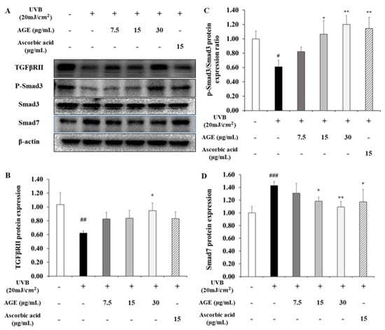 When the skin is exposed to UV, collagen degradation is caused not only by the upregulated MAPK/AP-1 pathway but also by the impaired TGFβ/Smad pathway. Therefore, we confirmed the alteration of the TGFβ/Smad pathway after AGE treatment in UVB-irradiated HDFs (Figure 8). The TβRII protein expression diminished by 0.6-fold of the untreated group due to UVB irradiation. As we treated 7.5, 15, and 30 µg/mL of AGE in UVB-induced HDFs, TβRII expression was recovered by 49, 51, and 78%, respectively. In addition, phosphorylation of Smad3 was significantly increased by AGE treatment compared to the UVB-irradiated group. In particular, 15 and 30 µg/mL of AGE, and 15 µg/mL of ascorbic acid normalized the phosphorylation ratio of Smad3. Additionally, AGE diminished Smad7 expression, inhibitory Smad. In 30 µg/mL of the AGE-treated group, Smad7 expression was decreased markedly by 79%. These results demonstrated that AGE is effective in anti-photoaging by regulating the TGFβ/Smad pathway.