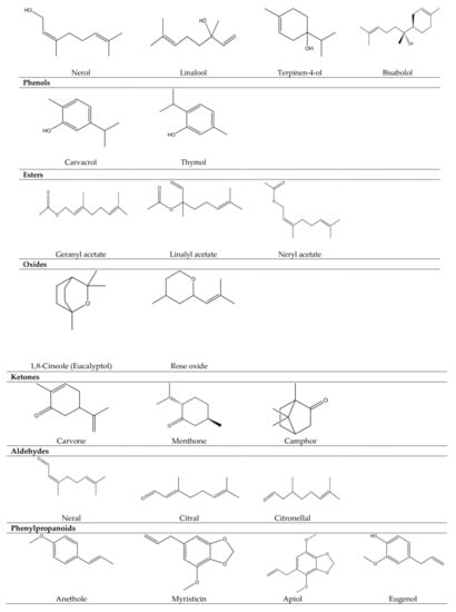 Essential oils can be composed of only a few to up to more than 100 single substances []. Being natural mixtures of a very complex nature, essential oils may consist of about 20–60 components at quite different concentrations, with two or three major components being present at fairly high concentrations (20–70%), compared with other components present in trace amounts []. The flavor contribution of single compounds, though, does not strictly depend on their respective concentration but relies on the specific odor threshold that is determined by structure and volatility. Consequently, even minor components deriving from oxidation or degradation reactions may have a strong impact on the flavor if their aroma value is high enough []. For the most part, essential oil components can be assigned as lipophilic terpenoids, phenylpropanoids, or short-chain aliphatic hydrocarbon derivatives of low molecular weight, with the first being the most frequent and characteristic constituents. Among these, allylic, mono-, bi-, or tricyclic mono- and sesquiterpenoids of different chemical classes make up a major part of essential oils, such as hydrocarbons, ketones, alcohols, oxides, aldehydes, phenols, or esters [] (Figure 1). The absence of even one component may change the aroma. In general, monoterpene hydrocarbons are less valuable regarding their contribution to the fragrance of the essential oil than oxygenated compounds, which are highly odoriferous []. In addition to their chemical properties, essential oils can be seen to vary greatly in their physical properties in terms of their density, refractive index, and rotatory power. For instance, the essential oils of the different organs (limbo, foliar sheath, and rhizomes) of Siphonochilus ethiopicus were reported to significantly differ in those physical properties. These properties contribute to a better characterization of plant essential oils [].