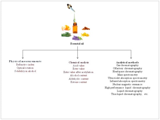 Essential oils have long been analyzed by measuring their physicochemical constants. These values indicate the quality of the oils and are critical for the detection of adulteration. The physical constants include the specific gravity, refractive index and optical rotation. Solubility is expressed in terms of solubility in ethyl alcohol and has a practical significance. On the other hand, the chemical constants used to assess essential oils are acid value, ester value after acetylation, as well as alcohol, aldehyde, and ketone contents, etc. These parameters demonstrate the characteristics of essential oils and are greatly helpful in evaluating their quality (Figure 2) [].