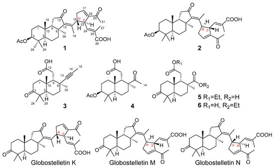- Li, J.; Zhu, H.; Ren, J.; Deng, Z.; de Voogd, N.J.; Proksch, P.; Lin, W. Globostelletins J–S, isomalabaricanes with unusual cyclopentane sidechains from the marine sponge Rhabdastrella globostellata. Tetrahedron 2012, 68, 559–565. [Google Scholar] [CrossRef]