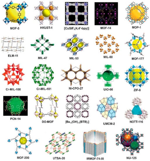 The availability of different metal ions and organic linkers results in the formation of MOFs with different physicochemical properties. Examples of typical MOF structures are demonstrated in Figure 2.