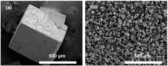 The rate of reaction can be significantly increased using microwave synthesis, which results in rapid achievement of high temperatures in localized zones. Examples of MOFs that have been synthesized employing this method include IRMOF-1 [96], HKUST-1 [116], and MIL-100-Cr [95]. To understand the mechanism of microwave synthesis, the rate enhancement was studied during the preparation of HKUST-1 [116]. It was found that the reaction rate enhancement was the result of an increase in the nucleation rate and not the crystal growth rate. In contrast, the outcomes of the investigation involving MIL-53 (Fe) demonstrated that both nucleation and growth rates contributed to the observed enhancement in the rate of reaction [117]. Despite the increased rate of reaction, using microwave-assisted heating results in significantly smaller crystals compared to other methods. For instance, the synthesis of MOF-5 utilizing the direct evaporation and microwave-assisted methods resulted in similar cubic-shaped MOFs; however, the crystal size of the microwave-heated material was approximately 20 times smaller (Figure 3) [118].