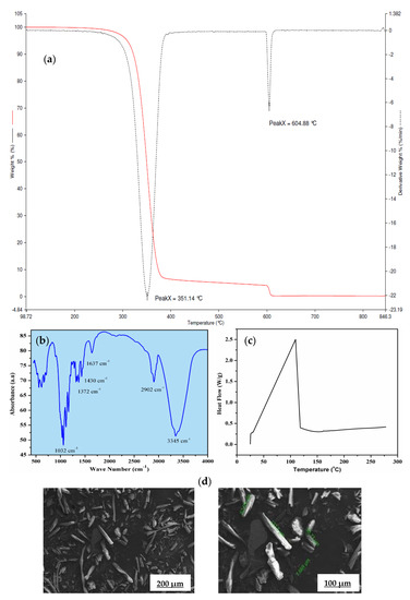 (a) Thermo-gravimetric (TG) and differential thermo-gravimetric (DTG) profile of α-cellulose, (b) Fourier transform infrared (FTIR) spectrum of α-cellulose, (c) heat flow curve of α-cellulose, (d) scanning electron microscopic (SEM) images of α-cellulose at 500× and 1000× magnification.