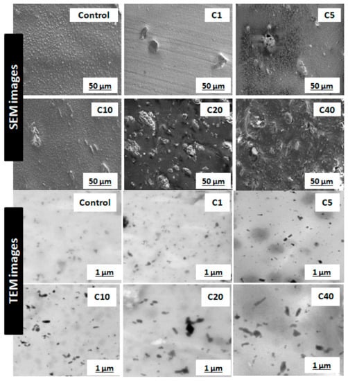 The most critical parameter for evaluation of α-cellulose is its dispersibility and distribution in the polymeric matrix. Characterization of filler morphology ranging from micro- to macro-scale determines reinforcing ability of α-cellulose. Microscopic analysis involving different instruments, namely SEM and TEM, are important to understand spatial resolution and orientation of filler particles throughout the matrix. SEM and TEM images of cured compounds are shown in Figure 3. It represents dispersion as well as distribution of α-cellulose in the elastomeric matrix. The images represented here are from cured stocks and captured at 2500× magnification for SEM and at 8600× magnification in the case of TEM. From TEM images, in the case of C1, C5 and C10, α-cellulose is well distributed throughout the E-SBR matrix. The increased dosage of filler (α-cellulose) leads to re-agglomeration of α-cellulose, which is very much evident from TEM images (Figure 3). Representative images of C20 and C40 clearly demonstrates agglomerated sites in the polymer matrix.