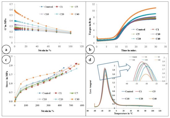 Figure 4a represents the storage modulus (G’) against strain (%) of the control gum compound and α-cellulose-containing compounds. It is obvious from the Figure 4a that as filler quantity increases, initial G’ also increases. ∆G’ is proportional to the filler volume fraction. This may be due to the presence of an increasing amount of -OH groups which re-agglomerates further to increase ∆G’.