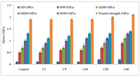 Figure 4b and Table 3 illustrate the rheological properties of all the composites. Maximum torque (MH) as well as minimum torque (ML) both increases as α-cellulose is added as filler in the E-SBR matrix. Upsurge of ML values can be attributed to improved rubber–filler interaction. Scorch safety or ts2, which is an important parameter for the processing of rubber compounds, is found to increase up to an addition of 10phr of α-cellulose, but after that, for compounds containing 20 and 40 phr of filler, ts2 of the system decreases. This phenomenon can be ascribed by the fact that hydroxyl (-OH) groups present in the system adsorb ZnO [11] and undergo complex formation. As a result, accelerator activation efficiency diminishes and scorch safety (ts2), consequently, increases. After C10, profound re-agglomeration of α-cellulose forms filler clusters (Figure 3) and, as a result, reinforcement ability of α-cellulose gets reduced in the E-SBR matrix. Poor dispersion and distribution of α-cellulose emanates re-agglomeration of -OH groups in the matrix. Thus, adsorption of ZnO on -OH groups increases effectively (due to increase in α-cellulose in the system). In addition to that, adsorption of the accelerator also takes place on the surface of remaining -OH groups. As a result, ts2 reduces significantly at a higher dosage of α-cellulose. Therefore, from a rheological as well as a processibility point of view, 10 phr addition of α-cellulose in the E-SBR matrix may be considered as optimal filler quantity that invokes optimized rheological behavior and process ability.