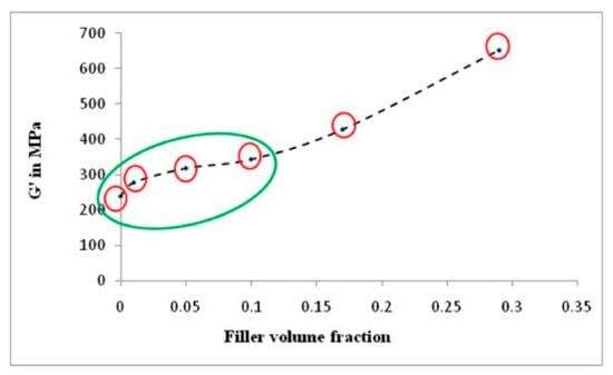 Plot of dynamic modulus (G′) vs. filler volume fraction (ϕ) in shear mode.