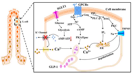 The ingestion of high-protein diets also was shown to increase GLP-1 secretion in rodents and humans [91,92]. Protein-induced GLP-1 secretion is likely executed via its enzymatic products, peptides and amino acids (AAs), which might act through peptide transporter-1 (PEPT1) and calcium-sensing receptor (CaSR) to induce GLP-1 secretion [93]. PEPT1 has a rather broad substrate specificity, as it has been demonstrated to transport di and tripeptides that have L-AA, an acidic, or hydrophobic group at C-terminus, a weak basic group in α-position at N-terminus, a ketomethylene or acid amide bond, or a trans conformation of peptide bonds [94,95]. In addition to PEPT1, CaSR is involved in the peptide-induced GLP-1 secretion. CaSR is a G-protein-coupled receptor widely expressed in human tissues. In the intestine, CaSR is involved in nutrient sensing [96] and serves as a broad-spectrum of L-aromatic AA sensor [97]. Studies showed that L-phenylalanine and L-tryptophan induce GLP-1 secretion through the CaSR-mediated mechanism [98,99]. The activation of CaSR triggers depolarization of the cell membrane that leads to the opening of the voltage-gated Ca2+ channel and subsequent influx of Ca2+ [100]. However, not all AAs elicit Ca2+-mediated GLP-1 secretion via a CaSR-independent mechanism. L-glutamine was shown to induce [Ca2+]i increase and GLP-1 secretion via a cAMP signaling-mediated but PLC-independent pathway [80], indicating that this AA-induced GLP-1 secretion is not associated with the activation of CaSR [101]. Interestingly, it was reported that L-cells also uptake L-glutamine through one of the Na+-dependent AA transporters, SLC38A2 [102]. Intracellular glutamine then enhances glutamate dehydrogenase and ATP production via promoting the citric acid cycle [103], which results in the depolarization of the cell membrane, triggering GLP-1 secretion. L-ornithine, a non-proteinogenic AA, can trigger GLP-1 secretion via activating the GPRC6A/Gαq/PLC/Ca2+ pathway [101].