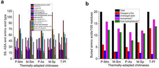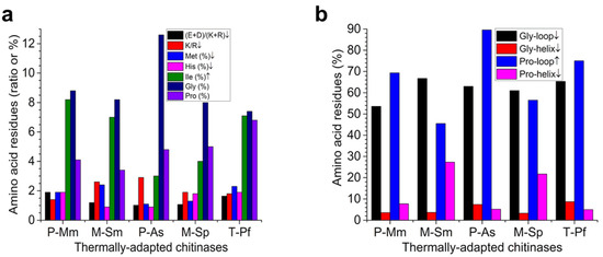 Compositional features in thermally adapted chitinases. (a) The relative number of amino acid residues (ratio or %). (b) Gly and Pro in the secondary structures (%). All features were analyzed using the ProtParam tool or PDB DeepView. ↑, higher value of the parameter is associated with higher stability; ↓, higher value of the parameter is associated with lower stability. P, psychrophilic; M, mesophilic; T, thermophilic. Mm, M. marina; Sm, S. marcescens; As, Arthrobacter sp.; Sp, S. proteamaculans; Pf, P. furiosus.