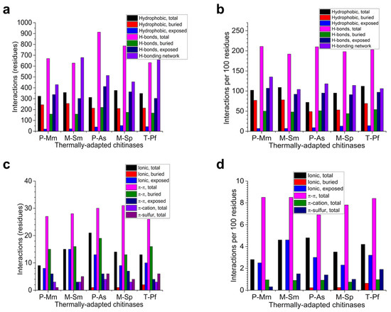 Higher numbers of interactions have been correlated with higher stability [13,27,29,33]. Mesophilic chitinases show higher numbers of hydrophobic interactions, whereas all other interactions were lower than their psychrophilic homologs (Figure 3). However, in the case of salt bridges and π–sulfur interactions, only M-Sm showed more interactions than P-Mm. (Figure 3, Table S1). Compared to mesophilic chitinases, both psychrophilic homologs showed a slightly higher number of total H-bonds per 100 residues, as determined using the PIC tool [38] (Figure 3a,b, Table S1). Similar results were obtained when the optimal H-bonding network was determined using the WHATIF tool [39]. The optimal H-bonding network is an extensive arrangement of one-to-one and bifurcated H-bonds that interconnect residues via other residues and water molecules [39]. A higher number of hydrogen bonds has been correlated with higher protein stability [40]. It is estimated that for a 10 °C rise in thermostability, an average of ≈13 H-bonds and salt bridges per chain are added. In a few protein families, H-bonds did not increase with enhanced thermostability; however, in these cases, an increase in salt bridges compensated for reduced H-bonds [41]. In contrast to the published results, this work implies that in thermally adapted chitinases (P-Mm vs. M-Sm and P-As vs. M-Sp) and T-Pf, H-bonds were not responsible for the higher stability of mesophilic and thermophilic chitinases, whereas more salt bridges may confer thermostability only in the case of the M-Sm vs. P-Mm pair (Figure 3, Table S1). Second, the dimeric structure of the mesophilic chitinase with 88 inter-subunit interactions (Table S1) may lead to stabilization, as described for other thermostable proteins by Vielle and Zeikus [33].