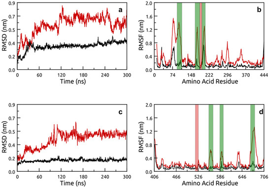 Backbone root-mean-square deviation (RMSD) and root-mean-square fluctuations (RMSF). (a,b) P-As and (c,d) T-Pf at 300 K (black) and 400 K (red). Identified primary floppy loops are highlighted in green with active sites in red.