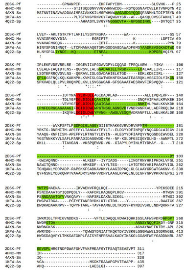 T-Pf had the least number of identifiable loops (22) compared with 24 each in P-Mm and M-Sm, 26 in M-Sp, and 30 in P-As. Importantly, T-Pf possesses only three loops with more than 10 residues, whereas for the cold-adapted chitinases, P-As had eight and P-Mm had five such large loops. Mesophilic M-Sm and M-Sp both possessed such loops. Analysis of the MD trajectories identified the loops with the largest motion and their proximity to the active site. Figure 6 shows the primary identified loops and the active-site strands within the multiple sequence alignment.