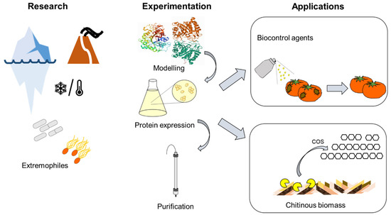 Perspectives linked to the agricultural uses of improved chitinases. Research involving the modeling of extremozymes and rational design can lead to superior catalysts in terms of stability. Such enzymes can be expressed in heterologous hosts, purified, and used as biocontrol agents or to degrade chitinous waste to yield chitooligosaccharides (COSs). COSs can in turn be applied as elicitors to improve biotic stress responses in crops.