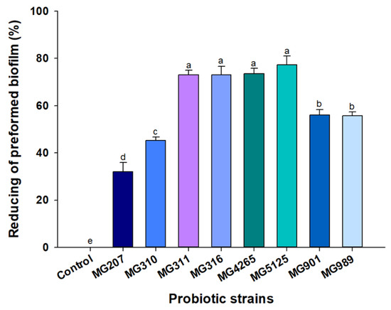 Reducing activity of SCSs of probiotic strains on S. mutans-induced biofilm. Different letters (a–e) indicate significant difference at p < 0.05.