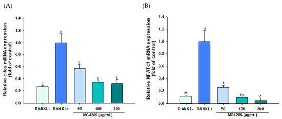 RANKL is an essential signaling molecule, and binding of RANKL to its receptor RANK induces the differentiation and activation of osteoclasts. This interaction stimulates the expression of osteoclast-specific key transcriptional effectors such as c-Fos and NFATc1 [39]. The effect of the SCS of L. salivarius MG4265 on the gene expression of these two transcriptional factors was examined using qRT-PCR. The gene expression of c-Fos and nuclear factor of activated T cells cytoplasmic 1 (NFATc1) was decreased by 55% and 27%, respectively, in response to 50 μg/mL MG4265 treatment (Figure 4A,B).