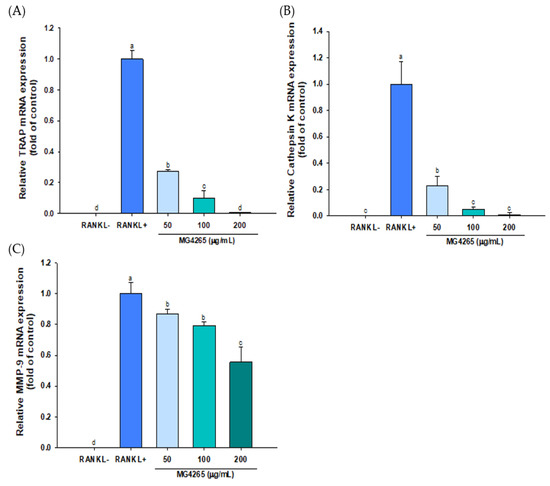 Osteoclast-specific gene expression, including TRAP, cathepsin K, and MMP-9 was also significantly decreased by treatment of MG4265 in a dose-dependent manner (Figure 5). Cathepsin K expression reflects the number of osteoclasts since it is mainly expressed in mature osteoclasts [44]. TRAP, cathepsin K, and MMP-9 play a key role in osteoclast-mediated degradation of bone organic matrices such as collagen and osteopontin [45,46]. Downregulation of TRAP, cathepsin K, and MMP-9 by L. salivarius MG4265 indicates that MG4265 can effectively inhibit bone resorption via regulation of osteoclast proteases. It has been demonstrated that the suppression of RANKL-mediated osteoclastogenesis in the RAW 264.7 cell model was highly correlated with decreased bone loss in ovariectomized rats [47].