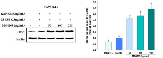 HO-1 is a stress-induced enzyme that modulates oxidative and inflammatory stress, and various phytochemicals inducing HO-1 have successfully inhibited RANKL-induced osteoclast differentiation [22,56]. RANKL exposure resulted in increased HO-1 expression, and it was further increased even with 50 μg/mL MG4265 treatment (Figure 7). The HO-1 induction was increased by 3.3-fold with treatment of 200 μg/mL of L. salivarius MG4265 (p < 0.05).