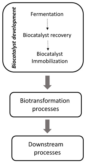 Aside from pharmaceutical and fine chemical applications, other sectors related to the production of bulk chemicals and less valuable products—with larger volumes—might also benefit from White Biotechnology approaches. In these segments, biocatalysis may bring several drivers to be considered, namely, environmental advantages, energy savings, regioselectivity, possibility of using thermolabile substrates, as well as potential penetration in novel markets (e.g., with natural labelling). Despite that untapped potential, however, applications of enzymes in these areas have traditionally attracted less interest, with only few examples at the industrial level [2]. Primarily, this may be related to the inherent costs associated with the production of biocatalysts, due to the need of numerous unit operations to produce them (Figure 1) [9,10]. A first upstream step—biocatalysis production—is subsequently followed by (bio)process optimization and downstream from typically aqueous solutions, to render the biocatalysts. This may become a challenge which often results in unacceptable overall costs; albeit in some cases, economy of scale may play an advantageous role [11]. Finally, biocatalysts must be immobilized to be (re)used several times to cope with economics of low added-value products in bulk chemical production.