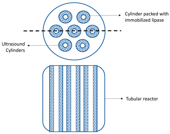 Another line of working in granted patents is the use of wasted cooking oil as substrate for the enzymatic processes. To build innovation and IP, this use is combined with process development approaches. For example, the design of a jacketed cylindrical reactor, in which several tubes are inserted, and packed inside with an immobilized lipase. An ultrasound system passes through the center of each tube (concentric) (Figure 4). This utility model allows the reaction system to be intensified, reducing reaction times and improving the economics of the process [33].