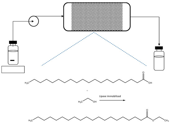 Esters are important bulk additives in both the cosmetic and food industries. Over the last five years, different inventions related to biotransformations and esters have been disclosed in the form of granted patents [47]. For example, the development of a continuous process in a packed-bed bioreactor for the production of docosahexanoic (DHA) and eicosapentaenoic acid (EPA) esters catalyzed by an immobilized lipase (Figure 8) has been implemented. The raw materials used in this process are ethanol and fats and oils rich in DHA and EPA. However, the batch reactor presents the disadvantages of reaching low conversions and rates. In order to overcome these hurdles, a continuous packed-bed process was developed which allowed the reaction rate to be increased, reaching a conversion greater than 90% at 60 °C with a residence time ranging between 0.1 and 60 min [48].