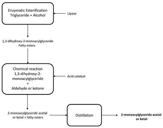 In general, the production of 2-monoglycerides poses challenges, since secondary alcohols, present in glycerol, are less reactive than primary alcohols. Additionally, the 2-monoglycerides are thermodynamically susceptible to suffer acyl migrations, forming 1,3 monoglycerides. This challenge has been recently addressed in a granted patent (Figure 9) [50]. The method comprises three steps. An unsaturated triglyceride is first reacted with at least two molar equivalents of water, a C1–C8 alcohol in the presence of a lipase at a temperature within the range of 20 to 80 °C to produce a mixture of 1,3-dihydroxy-2-monoacylglyceride and fatty esters or acids. The 1,3-dihydroxy-2-monoacylglyceride is then reacted with at least one molar equivalent of an aldehyde or ketone, optionally in the presence of an acid catalyst, to produce a mixture comprising a 2-monoacylglyceride acetal or ketal. Next, the fatty esters or acids are removed from the mixture as an overhead product by distillation or wiped-film evaporation to isolate a purified 2-monoacylglyceride acetal or ketal. Preferably, the 2-monoacylglyceride acetal or ketal is further purified by distillation to separate it from less volatile impurities. Food grade aldehydes or ketones such as acetaldehyde, hexanal, octanal, benzaldehyde, cinnamaldehyde, vanillin, ethyl vinyl ketone, 2-furyl methyl ketone, methyl 2-pyrrolyl ketone, watermelon ketone and raspberry ketone are preferred. Organic acid catalysts such as acetic acid or p-toluen-sulfonic acid are preferred. An important aspect of this technology is that it makes use of distillation as a separation process, which allows the process to be scaled up, in contrast to more challenging chromatographic separations [50].