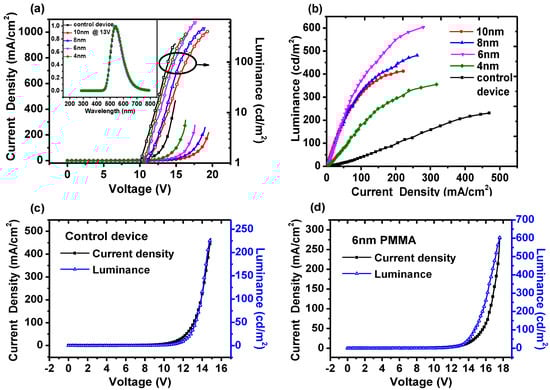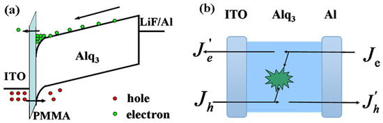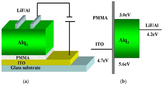 - Kim, Y.; Park, H.; Kim, J. Enhanced quantum efficiency in polymer electroluminescence devices by inserting a tunneling barrier formed by Langmuir–Blodgett films. Appl. Phys. Lett. 1996, 69, 599–601. [Google Scholar] [CrossRef]