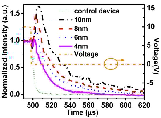 - Xu, M.; Peng, Q.; Zou, W.; Gu, L.; Xu, L.; Cheng, L.; He, Y.; Yang, M.; Wang, N.; Huang, W.; et al. A transient-electroluminescence study on perovskite light-emitting diodes. Appl. Phys. Lett. 2019, 115, 041102. [Google Scholar] [CrossRef]