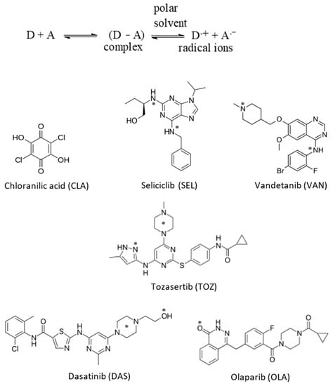 From the presented information, establishing a universal spectrophotometric method for assaying any TKI irrespective of its chemical structure would be of great benefit and convenience. This research is directed to establish a novel 96-microwell-based spectrophotometric assay (MW-SPA) that could be applied in QC laboratories for reliable and accurate determination of any TKI. The proposed approach is based on formation of charge-transfer complexes (CTCs) between TKIs and chloranilic acid (CLA). The proposed procedure was established and validated for five TKIs. These TKIs were seliciclib (SEL), vandetanib (VAN), tozasertib (TOZ), dasatinib (DAS) and olaparib (OLA); their chemical structures are given in Figure 1. Their chemical names, molecular formulae and molecular weights are given in Table 1.