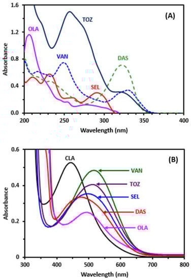 Panel (A): Absorption spectra of TKIs (10 µg/mL). Panel (B): absorption spectra of CLA (0.1%, w/v), and its reaction mixtures with TKIs (100 µg/mL). All solutions were in methanol.