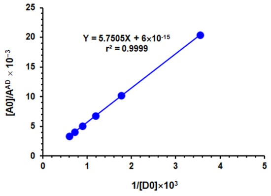 A set of TKI solutions ranging from 1.79 × 10−4 to 1.85 × 10−3 M were swirled with a constant CLA concentration (4.8 × 10−3 M). The reaction was instant at room temperature (25 ± 2 °C). The absorbances of the colored solutions were recorded at their absorption peaks against exactly prepared reagent blanks. The measured absorbances were utilized to produce the plot of Benesi–Hildebrand [58] by plotting the values [A0]/AAD versus l/[D0]. Linear regression analysis was shown for the data using the following Benesi–Hildebrand equation [60]: