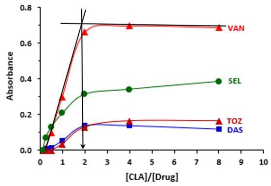 The published spectrophotometric titration methodology [52] was adopted to find out the molar ratio of TKI to CLA, and it was found to be 1:1 for OLA and 1:2 for SEL, VAN, TOZ and DAS (Figure 5). The molecular modelling and energy minimization of the TKI molecules and the CTC were performed, and the electron density of each atom was computed for allocation of these sites from the multiple electron-donating sites that exist on TKI molecules (Figure 1).