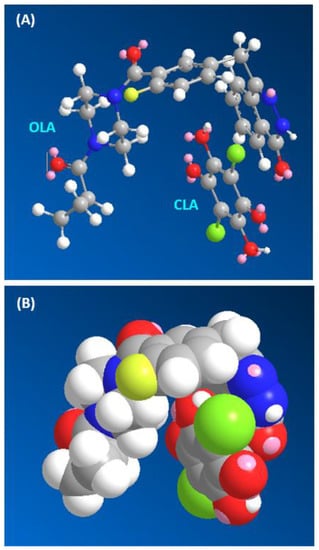 The molecular modelling was done with CS Chem3D Ultra, version 16.0, and execution took place by molecular orbital computations software (MOPAC) and molecular dynamics computations software (MM2 and MMFF94). The most likely sites for the interaction between CLA and TKI are found on the TKI, which have the highest electron density (Table 3). For verification of these sites’ participation, energy minimization was performed for one molecule of TKI with the number of CLA molecules obtained from the molar ratios. The CLA molecule was observed adjacent to the suggested sites with the highest electron density (Figure 6). Exceptionally in the case of OLA, the CLA molecule was adjacent to the carbonyl oxygen atom (O11), although it had lower electron density than those on the amide nitrogen atoms (N22 and N25). This information confirmed that CLA–TKI interactions happen through n → π* interactions. From the results of the molar ratio and computational molecular modelling, it was clear that these are the electron-donating sites on TKI molecules that are involved in generation of the produced CTCs with CLA.