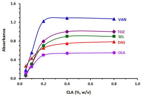 Effect of CLA concentration on its reaction with TKIs (200 µg/well). Measurements were carried out at 490 nm.