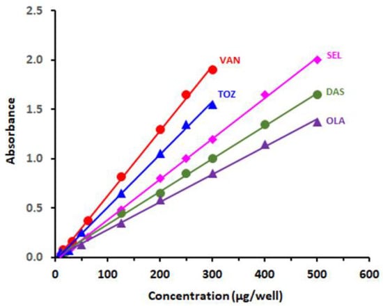 The calibration curves were constructed (Figure 8) according to optimum conditions of the MW-SPA (Table 4), and the least square method was used for linear data regression. Calibration curves in the range of 10–500 µg/well (100 µL) were linear with excellent correlation coefficients. The limits of detection (LOD) and quantitation (LOQ) were determined based on the International Conference on Harmonization (ICH) guidelines [60]. The LOD and LOQ levels lay at 3.78–8.16 and 11.36–24.46 µg/well, respectively. A summary for the calibration and validation parameters of the current MW-SPA is given in Table 5.