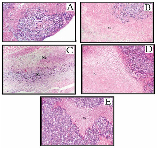 (A) Tumor section of Ehrlich positive control mouse showed an area of necrosis (Ne). (B) Tumor section of Ehrlich ascites carcinoma (EAC) bearing mouse treated with compound 6a displayed massive, coagulated necrosis (Ne) with minimal residual malignant cells at the upper right corner. (C) Tumor section of Ehrlich ascites carcinoma (EAC) bearing mouse treated with compound 6b displayed extensive necrosis (Ne) with minimal viable malignant cells. (D) Tumor section of Ehrlich ascites carcinoma (EAC) bearing mouse treated with compound 6c showed a massive area of coagulative necrosis (Ne) with viable tumor cells at the right side. (E) Tumor section of Ehrlich ascites carcinoma (EAC) bearing mouse treated with compound 6d showed massive geographic coagulative necrosis (Ne) surrounded by viable tumor cells. (H and E × 200).