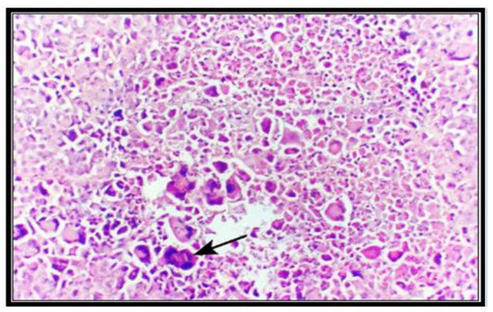 Malignant tumor of Ehrlich ascites carcinoma (EAC) bearing mouse treated with indoloquinoline compounds 6a, 6b, 6c and 6d showed criteria of anaplasia, necrosis. Moreover, small clusters of apoptotic cells (arrow) were observed. The apoptotic cells displayed dense basophilic nuclei and dense eosinophilic cytoplasm. (H and E × 200).