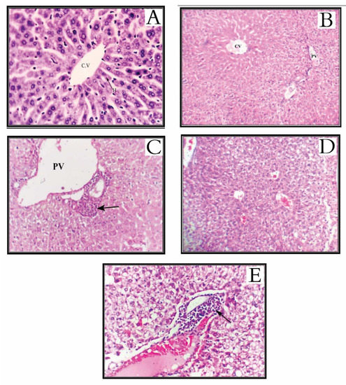 (A) Liver section of normal mouse showing cords of hepatocytes (H) radiating from the central vein (C.V) and separated by blood sinusoids (H and E × 400). (B) Liver section of normal mouse treated with compound 6a showed preserved lobular architecture with mild degenerative changes. Central vein (CV) and portal vein (PV) could be seen. (C) Liver section of a normal mouse treated with compound 6a showed mild degenerative changes and mild portal lymphocytic infiltrates (arrow) surrounding the portal vein (PV). (D) Liver section of normal mouse treated with compound 6b showed mild diffuse degenerative changes, mild congestion, and scattered lymphocytes. (E) Liver section of normal mouse treated with compound 6c showed a moderate diffuse degenerative change in the form of feathery degenerative changes. Moreover, a wide dilated portal vein and mild portal perivascular lymphocytic infiltrates (arrow) are seen. (×200 H and E).